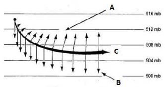 Diversas forças atuam em uma parcela de ar em movimento. Identifique na figura seguinte o local de ocorrência do fenômeno representado, bem como as denominações das componentes A, B e C.