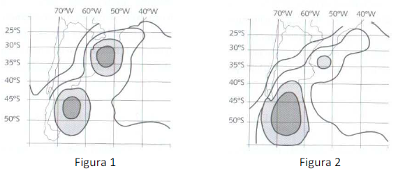 As figuras abaixo, extraídas do livro Tempo e Clima no Brasil, fazem parte do trabalho de Sinclair (1996) e representam a frequência de ocorrência de ciclogênese na América do Sul em duas épocas distintas do ano, entre 1980 e 1994. As isolinhas estão plotadas a cada 0,5 ciclones por uma área circular de 555 km por mês, com valores de 1,5 e 2,0 destacados. Identifique a alternativa que corresponde à época do ano a que cada figura se refere e cujas argumentações sejam adequadas para explicar o comportamento sazonal: