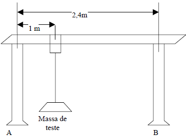 Uma viga de concreto, de 2,4 m de comprimento, apoia-se em duas colunas “A” e “B”. Supondo sua distribuição de massa homogênea e que, a 1 m do apoio da coluna “A” é posicionada uma massa teste de 180 Kg, calcule as reações nos apoios “A” e “B”.