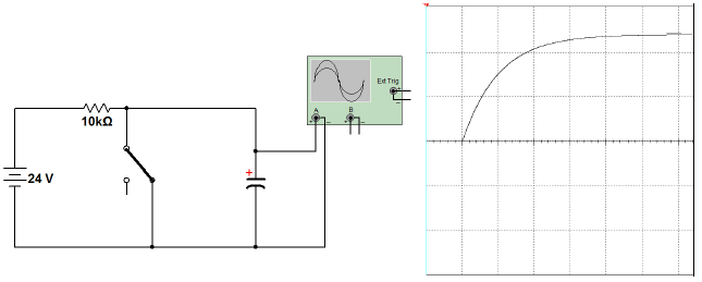 O circuito a seguir está com a chave fechada. Em um determinado instante de tempo, a chave é aberta. Determine o valor do capacitor com base na leitura da tela do osciloscópio. O osciloscópio estava configurado com 10V/Div e 50 ms/Div.