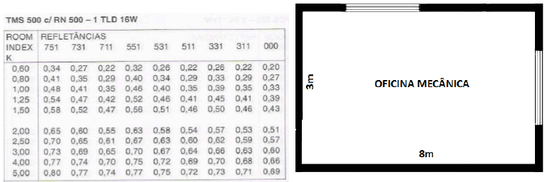 Determine o número mínimo de lâmpadas necessárias para um ambiente classe B, representado na figura abaixo, que requer 300 lux pelo método dos lumens e apresenta pé direito de 2,7 m e as lâmpadas ficarão no teto. Para o projeto, será adotada uma lâmpada TLD 16W que possui 1200 lm. Considere da reflexão do teto de 70%, parede de 50% e piso 10%. O ambiente é sujo e será usado fator de depreciação de 0,57.