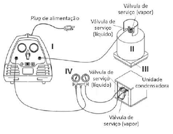 A figura acima ilustra um arranjo de componentes requeridos para efetuar uma operação de recolhimento do fluido refrigerante em uma unidade condensadora. Considerando os conhecimentos e as boas práticas para tal operação de recolhimento e a figura, julgue o item a seguir.