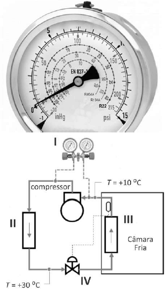 O sistema de refrigeração mostrado na figura acima opera com o refrigerante R22. Desprezando as perdas de pressão e a influência das tubulações e considerando que os manômetros do conjunto I são idênticos aos mostrados acima, julgue o item a seguir.