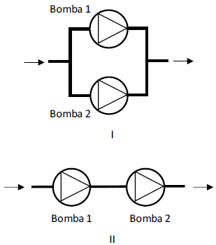 No que se refere aos arranjos I e II de bombas hidráulicas mostrados acima, julgue o item a seguir.
