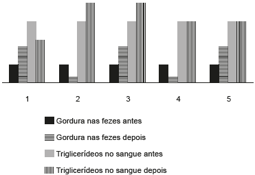 Há algumas décadas, surgiu no mercado um medicamento que provocava perda de peso por inibir a ação da lipase, enzima que atua no intestino na digestão de gorduras. Um pesquisador, com o objetivo de avaliar a eficácia do medicamento, decidiu medir nos pacientes a quantidade de gordura nas fezes e de triglicerídeos (um dos produtos da digestão das gorduras) no sangue. Mantendo sempre a mesma dieta nos pacientes, fez as medidas antes e depois da administração do medicamento. A figura apresenta cinco resultados possíveis.