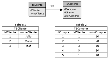 A figura a seguir apresenta o diagrama das tabelas TBCliente e TBCompras, e as tabelas 1 e 2 apresentam, respectivamente, os registros TBCliente e TBCompras.