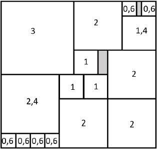 Os valores na figura representam as medidas, em metros, dos lados dos quadrados. Na arte dos amigos, surgem apenas dois retângulos. Assim, as medidas do maior e menor retângulos, respectivamente, são: