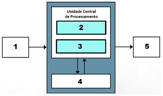 A figura abaixo apresenta os componentes básicos da arquitetura de Von Neumann de computadores, numerados de 1 a 5.