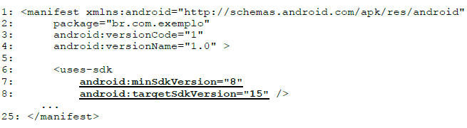 android.minSdkVersion: A versão mínima da API Android que um dispositivo deve possuir para conseguir executar a aplicação android.targetSdkVersion: A versão alvo da API Android para a qual a aplicação foi especificamente compilada