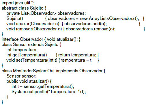 Qual das alternativas descreve modificações no código acima que completam de forma adequada a implementação do padrão Observador (em inglês, Observer)?