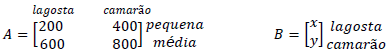 Um restaurante oferece um prato com dois ingredientes, lagosta e camarão, em porções pequena e média. A matriz A apresenta a quantidade, em gramas, de cada um dos ingredientes nas duas porções e a matriz B, o valor do quilograma de cada um dos ingredientes.