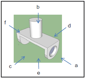 Considerando a figura acima e de acordo com os princípios gerais de representação em desenho técnico, em relação à posição relativa das vistas no 1º diedro, fixando-se a vista frontal (a), as posições relativas das outras vistas são as seguintes: