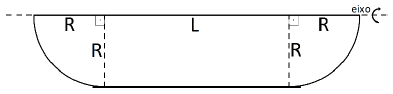 Um pescador atravessou um rio, percorrendo um total de 4 km, em 10 minutos. Durante a travessia retilínea, o barco parou e virou, na metade do percurso. O pescador rapidamente conseguiu desvirá-lo, mas entrou muita água no barco, ocupando 60% de seu volume. Enquanto o pescador retirava a água com um copo cônico de 20 cm de altura e 8 cm de raio, o barco, à deriva, ia sendo levado pela maré no mesmo sentido do percurso. Após diminuir a água do barco pela metade, o pescador remou até finalizar a travessia, mesmo com o barco pesado. Sabe-se que o pescador, remando, faz 40 km em uma 1 h, sem água no barco, e 30 km em 1 h, com água no barco. Além disso, o barco tem um formato igual à metade do sólido gerado pela rotação da figura acima. O lado L do retângulo mede 4 m e o raio R de curvatura mede 1 m.