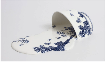 I. A artista brinca com a percepção do espectador, de modo que a porcelana da xícara quebrada parece se esparramar sobre uma superfície, como se fosse outro material e com um novo formato.