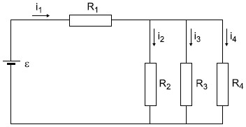 Um circuito elétrico é constituído por um gerador de força eletromotriz ε e quatro resistores, R1, R2, R3 e R4, os quais são percorridos, respectivamente, pelas correntes elétricas i1, i2, i3 e i4, como mostrado na figura.