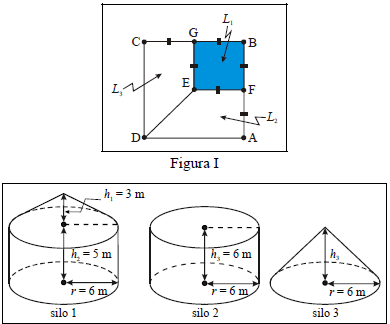 Nesse contexto, considere que um terreno na forma de um quadrado ABCD seja dividido em três lotes indicados por L1, L2 e L3, como mostra a figura I abaixo. O lote L1 é um quadrado de área igual a 100 hectares e de lado igual à metade do lado do quadrado ABCD. O segmento DE é parte da diagonal BD. Nos lotes L1, L2 e L3, são plantados arroz, milho, trigo einkorn e trigo emmer, que são, após a colheita, armazenados nos silos de alumínio 1, 2 e 3, cujos formatos e dimensões estão mostrados na figura II. O silo 1 é formado pela justaposição de um cilindro com um cone, enquanto os silos 2 e 3 são, respectivamente, um cilindro e um cone.