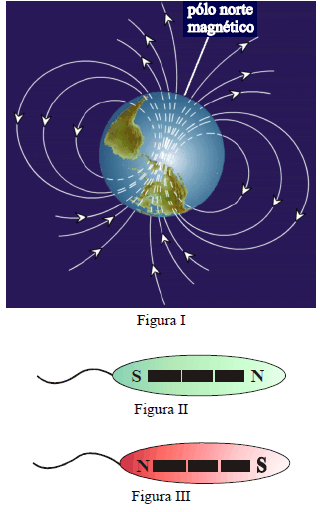 Pesquisadores estudaram bactérias flageladas que produzem cristais de magnetita (Fe3O4) ou greigita (Fe3S4), os quais se alinham ao campo magnético terrestre, cujas linhas de campo estão ilustradas na figura I acima. Uma vez orientadas por esse campo, as bactérias movimentam continuamente seus flagelos e, assim, seguem para regiões mais profundas dos oceanos. Esse tipo de bactéria não sobrevive em regiões com alta concentração de oxigênio, como por exemplo, na superfície de oceanos. Essas bactérias podem ser de dois tipos, representados esquematicamente nas figuras II e III. As bactérias do tipo ilustrado na figura II são encontradas em grande quantidade no hemisfério sul magnético, enquanto as do tipo ilustrado na figura III são características do hemisfério norte magnético.