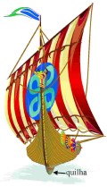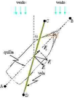 Quando se viaja na direção e sentido do vento, o barco a vela, como o ilustrado na figura abaixo, é submetido à pressão do vento em sua vela, que impulsiona a embarcação para frente. Mas, ao navegar contra o vento, a vela é exposta a forças que dificultam o processo de deslocamento, o que requer perícia dos velejadores. Os fluidos não resistem às forças tangenciais, apenas às normais. O movimento de um barco a vela navegando contra o vento pode ser representado pelo diagrama de forças ilustrado na figura acima, que mostra um barco a vela sujeito à força do vento cujos sentido e direção também estão ilustrados na figura. A quilha do barco se localiza ao longo do eixo AB. A componente efetiva do impacto do vento sobre a vela, que é indicada pelo segmento CD, é representada pelo vetor Fv perpendicular à vela. Essa força pode ser decomposta na componente Fb, que impulsiona o barco para a frente, no sentido de A para B, e na componente Fr, que, devido à quilha, é anulada pela resistência oferecida pela água.