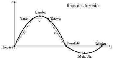 Um navio segue a rota entre as ilhas Honiara e Tokelau. O percurso entre Honiara, Yaren, Banaba, Tarawa e Funafuti pode ser considerado como parte do gráfico de um polinômio p(x) do segundo grau. O percurso entre Funafuti, Mata Uta e Tokelau também pode ser considerado como parte do gráfico de um polinômio q(x) do segundo grau, conforme mostrado na figura acima, que também ilustra uma rota alternativa entre Honiara e Funafuti correspondente aos segmentos de retas r, s e t, cuja soma dos comprimentos é igual a 22 na escala utilizada nos eixos Ox e Oy do sistema cartesiano xOy apresentado. Considere que, no sistema xOy, as ilhas citadas correpondam aos seguintes pontos: Honiara = (0, 0); Yaren = (6, \alpha); Banaba = (7, \beta); Tarawa = (8, \alpha); Funafuti = (\gamma, 0); Mata Uta = (19, -2) e Tokelau = (\delta, 0); e que a ilha de Mata Uta esteja sobre o vértice da parábola que corresponde ao gráfico de q(x).