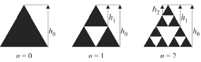 Por permitirem que os smartphones utilizem uma única antena para sinais de GPS, de wi-fi, de bluetooth e outros, as antenas fractais, operando em diversas frequências, são mais versáteis que as comuns. Um modelo de antena fractal, que usa o triângulo de Sierpinski, pode ser construída a partir de uma chapa de metal no formato de um triângulo equilátero de altura h0. Nesse estágio (estágio 0), a antena trabalha em uma frequência f0; aqui { \large f_0 \over h_0} = K. Eliminando-se da chapa de metal o triângulo formado pelos pontos médios dos lados do primeiro triângulo, restam três triângulos de metal, equiláteros e de altura h1. Nesse estágio (estágio 1), a antena continua trabalhando na frequência f0, mas passa a trabalhar também na frequência f1, em que f1 é tal que { \large f_1 \over h_1} = K, e k é a mesma constante do estágio 0. Repetindo sucessivamente o processo de retiradas de triângulos da chapa de metal, incluem-se novas frequências, f2, f3, ..., fn, ..., em que, para cada n, fn é tal que { \large f_n \over h_n} = K , hn é a altura do triângulo equilátero no estágio n, e k é a mesma constante dos estágios anteriores. As figuras a seguir exemplificam os estágios 0, 1 e 2.