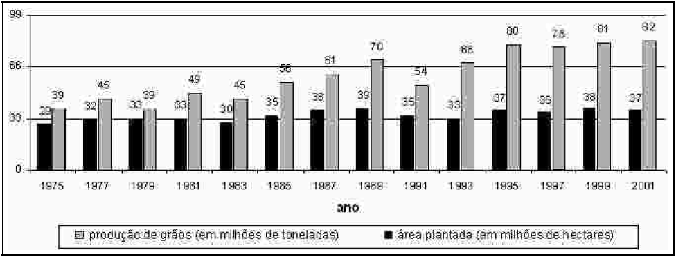 Com o auxílio da figura acima, que ilustra a evolução da produção de grãos e da área plantada no Brasil, julgue os itens a seguir.