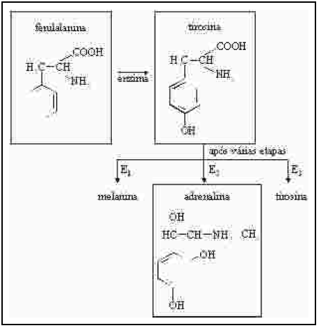 A figura abaixo ilustra vias metabólicas da fenilalanina e da tirosina, em que E1, E2 e E3 representam enzimas.