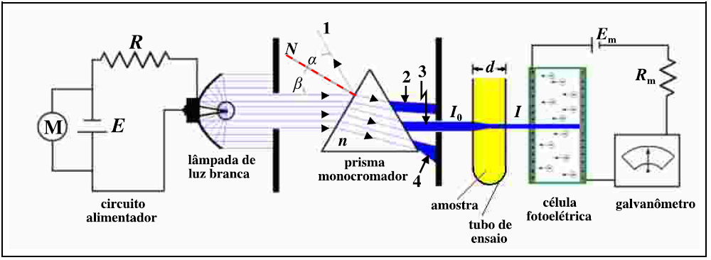 O espectrofotômetro, aparelho que permite medir esses parâmetros, está representado na figura acima. A figura mostra o circuito alimentador da lâmpada de luz branca. Esta, incidindo em um prisma, é decomposta nos seus diferentes comprimentos de onda. A intensidade de luz transmitida é detectada por uma fotocélula que gera uma corrente elétrica que pode ser medida por um galvanômetro. No circuito elétrico alimentador da lâmpada de luz branca, existe um fusível de proteção com resistência igual a RΩ. A voltagem fornecida pela fonte E é de 40 V. A lâmpada dissipa 20 W a uma voltagem máxima de 5 V. No espectrofotômetro apresentado, N é normal à superfície do prisma e as paredes do tubo de ensaio têm espessura desprezível.