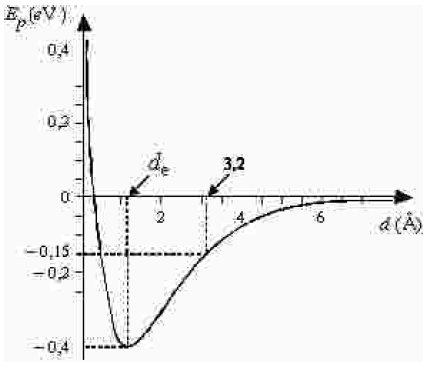 A figura acima representa a variação da energia potencial — Ep — em função da distância — d — entre os átomos de hidrogênio e oxigênio participantes da ligação H–O da fenilalanina, tendo como referência o átomo de oxigênio. A energia total — E — é a soma das energias cinética — Ec — e potencial, isto é, E = Ec + Ep = -0,15 eV no caso em estudo. A energia é dada em elétron-volt (eV) e a distância, em angström (Å). O ponto de energia potencial mínima, denominado ponto de equilíbrio, é alcançado quando a distância entre os átomos for igual a de. Próximo ao ponto de equilíbrio, a energia potencial pode ser aproximada pela função quadrática Y(x)= \frac{Å}{2}x^2 -0,4, em que x representa o deslocamento do átomo em relação ao ponto de equilíbrio e k é uma constante de proporcionalidade.