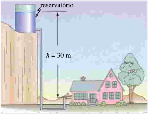 Considere que a figura a seguir mostra, de forma esquemática, a tubulação de água entre um reservatório e uma residência. Suponha que a aceleração da gravidade no local seja constante e igual a 10 m/s2, que a superfície da água no reservatório esteja 30 m acima do ponto de água da residência, que a densidade da água seja igual a 1,0 g/cm3 e que a transmissão do líquido nos tubos seja ideal e ocorra na ausência de forças restritivas e de turbulências. Nesse caso, a pressão da água que chega no ponto de água da residência é superior a 5,0 × 105 Pa.
