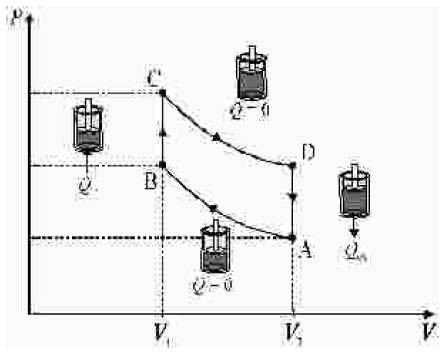 III de C para D (expansão): os gases expandem-se adiabaticamente realizando trabalho motor;