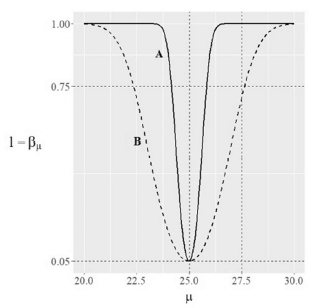 Considerando que a figura acima mostra as curvas de poder referentes a dois testes de hipóteses - A (linha contínua) e B (linha tracejada) - para a média populacional \mu, julgue o item a seguir.