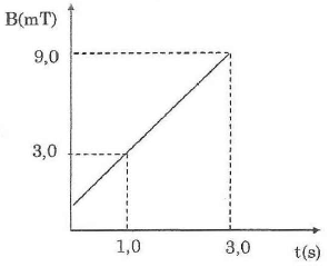 Considere uma região do espaço em que a intensidade do campo magnético, apontando para cima, esteja variando em função do tempo como mostrado no gráfico abaixo. Uma espira quadrada condutora de lado 20,0 cm e resistência R = 10,0 \ m \Omega é mergulhada nessa região de tal forma que as linhas de campo sejam perpendiculares ao seu plano. Quando a espira é vista por cima, o módulo e o sentido da corrente nela induzida são