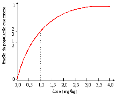 Os organismos diferem entre si significativamente quanto à suscetibilidade a determinada substância — alguns respondem a doses muito baixas de uma substância, outros requerem doses mais elevadas para reagir. Por isso, foram criados a relação dose-resposta, para se determinar a toxicidade de uma substância, e o termo dose letal (LD50), que expressa a dose dessa substância que mata 50% da população a ela exposta. Desse modo, a dose da substância administrada é expressa como massa do composto, usualmente em miligramas, por unidade de massa corporal do organismo testado, habitualmente expressa em quilogramas. Considere que, para determinada substância, a função que descreve a fração da população que morre — F — em termos da dose dessa substância — x, em mg/kg — seja dada por F(x) = a + b3-x, em que a e b são constantes que podem ser determinadas utilizando-se o gráfico dessa função, ilustrado acima.