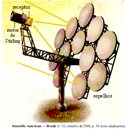 As mudanças climáticas têm induzido intensa procura por fontes alternativas de energia não-poluentes. Entre essas fontes alternativas, está a energia solar, que pode ser utilizada para produção de energia elétrica ou de combustíveis, como o hidrogênio. A figura acima mostra a unidade geradora de uma usina solar, composta por espelhos parabólicos que captam a luz do Sol e a focalizam em um receptor. A energia solar concentrada é convertida em calor no receptor e usada para acionar um motor de Stirling de alta eficiência que, por sua vez, aciona um gerador de energia elétrica. O conjunto de espelhos se movimenta, acompanhando o Sol, para maximizar a quantidade de energia captada.