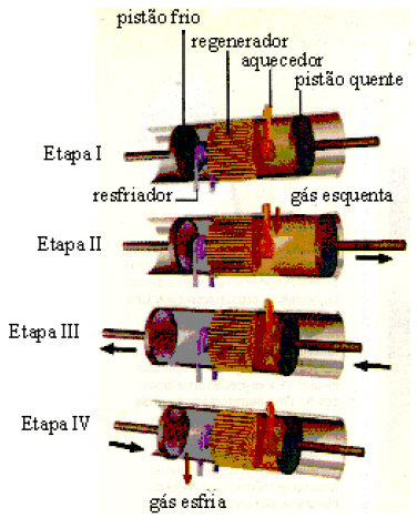 O esquema acima ilustra o princípio de funcionamento de um motor de Stirling, que consiste em quatro etapas. Esse motor utiliza um gás para transferir calor entre uma fonte quente (aquecedor) e uma fonte fria (resfriador), e, nessa transferência, realiza trabalho mecânico girando um eixo. Na etapa I, o pistão frio é mantido fixo enquanto o aquecedor cede energia ao gás no lado quente. Na câmara com o aquecedor, o gás se expande, empurrando o pistão quente (etapa II). No próximo passo (etapa III), o pistão é empurrado de volta pela própria inércia de rotação do eixo, ao mesmo tempo em que o pistão frio também recua, na mesma velocidade. Assim, com o movimento simultâneo dos pistões, o sistema mantém volume constante enquanto o gás é transferido da câmara quente para a câmara fria através do regenerador, uma peça que permite a passagem do gás, mas mantém a diferença de temperatura entre as câmaras. Na câmara fria, o gás é resfriado, o que reduz a sua pressão e traz o pistão frio de volta ao ponto inicial do ciclo, que então se repete (etapa IV).