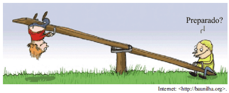 Na situação ilustrada no quadrinho abaixo, em que uma extremidade da gangorra se encontra apoiada no solo, os torques produzidos pelas forças-peso dos dois garotos em relação ao eixo da gangorra se anulam.