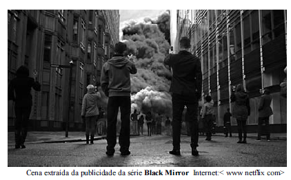 Considerando essa imagem, extraída da publicidade da série Black Mirror, julgue os itens que se seguem.