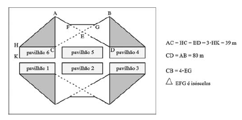 Muitos filmes e séries de TV, a exemplo de Prision Break, mostram o cotidiano de agentes penitenciários e de presidiários em um conjunto prisional e a constante ansiedade dos presidiários pela fuga da prisão. A figura precedente mostra a planta de um conjunto prisional composto de seis pavilhões retangulares, numerados de 1 a 6, onde ficam as celas. Os triângulos anexos aos pavilhões são triângulos retângulos e a base do triângulo EFG é paralela a AB.