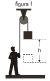 Há um antigo aforisma grego que diz: “o que se poupa em esforço, perde-se em tempo”. Para verificar a veracidade desta afirmativa, suponhamos que uma pessoa, com o auxílio de uma corda e de uma roldana fixa (ambas ideais), deseje suspender um bloco, com movimento uniforme, fazendo com que ele suba uma altura h. Numa primeira tentativa ele faz o bloco subir verticalmente, como ilustra a figura 1 a seguir.