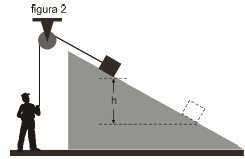 Nesse caso, a pessoa exerce sobre o bloco uma força \vec{F}_1 por intermédio da corda e o bloco gasta um tempo t1 para subir h. Numa segunda tentativa, ela faz o bloco subir uma rampa inclinada em relação à horizontal, ao longo da reta de maior declive, como ilustra a figura 2 a seguir.