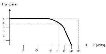 O gráfico a seguir a apresenta a curva corrente x tensão de uma placa fotovoltaica (PFV) hipotética, com alguns pontos notáveis indicados.