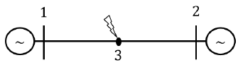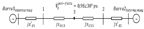 Considere um sistema formado por duas máquinas conectadas por meio de uma linha de transmissão. Uma falta trifásica ocorre no ponto 3 da linha conforme o diagrama a seguir.