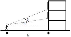 Parada a uma distância de 6 m de um prédio, uma pessoa observa os parapeitos de duas janelas, respectivamente sob os ângulos \alpha = 30^{ \circ} e \beta = 45^{ \circ}, conforme ilustra a figura abaixo.