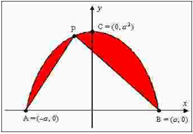 Considere que o contorno do calcanhar de um bebê submetido ao teste do pezinho possa ser descrito, conforme mostrado na figura acima, no sistema de coordenadas cartesianas xOy, por uma parábola cujo gráfico contenha os pontos A = (-a, 0), B = (a, 0) e C = (0, a2), em que a > 1, e a unidade de medida nos eixos coordenados é o centímetro. Considere que P = (x0, y0), em que !a < x0 < a, seja um ponto da parábola que é vértice do triângulo APB. Sabendo que a área entre a parábola e o eixo Ox, para -a \le x \le a, é igual a \frac{4}{3}a^2 cm2, represente por R a região do calcanhar, fora do triângulo APB — região sombreada na figura acima —, que contém possíveis locais de punção para o teste do pezinho.