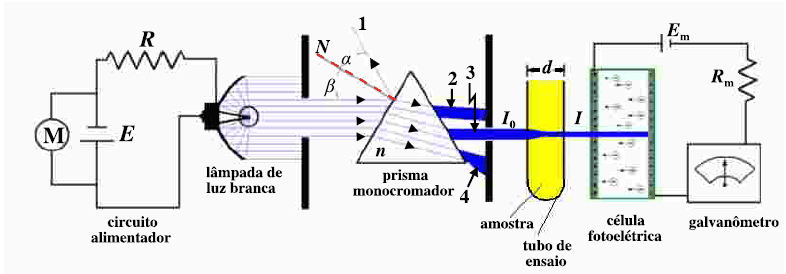 O espectrofotômetro, aparelho que permite medir esses parâmetros, está representado na figura acima. A figura mostra o circuito alimentador da lâmpada de luz branca. Esta, incidindo em um prisma, é decomposta nos seus diferentes comprimentos de onda. A intensidade de luz transmitida é detectada por uma fotocélula que gera uma corrente elétrica que pode ser medida por um galvanômetro. No circuito elétrico alimentador da lâmpada de luz branca, existe um fusível de proteção com resistência igual a R \Omega. A voltagem fornecida pela fonte E é de 40 V. A lâmpada dissipa 20 W a uma voltagem máxima de 5 V. No espectrofotômetro apresentado, N é normal à superfície do prisma e as paredes do tubo de ensaio têm espessura desprezível.