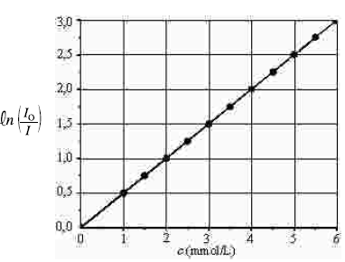 Considere que a absorção da substância A medida pelo espectrofotômetro mostre que \frac{I_0}{I} = e, em que e é a base do logaritmo neperiano. Nesse caso, é correto concluir que a concentração da substância A na solução analisada é igual a 5 mmol/L.
