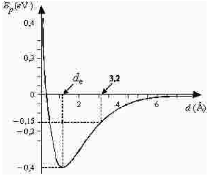 A figura acima representa a variação da energia potencial — Ep — em função da distância — d — entre os átomos de hidrogênio e oxigênio participantes da ligação H–O da fenilalanina, tendo como referência o átomo de oxigênio. A energia total — E — é a soma das energias cinética — Ec — e potencial, isto é, E = Ec + Ep = -0,15 eV no caso em estudo. A energia é dada em elétron-volt (eV) e a distância, em angström (Å). O ponto de energia potencial mínima, denominado ponto de equilíbrio, é alcançado quando a distância entre os átomos for igual a de. Próximo ao ponto de equilíbrio, a energia potencial pode ser aproximada pela função quadrática Y(x) = \frac{k}{2}x^2 - 0,4, em que x representa o deslocamento do átomo em relação ao ponto de equilíbrio e k é uma constante de proporcionalidade.