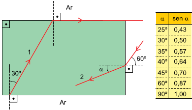 Considerando os valores apresentados na tabela e sabendo que o índice de refração absoluto do ar é nAr = 1, a medida do ângulo α indicado na figura é, aproximadamente,