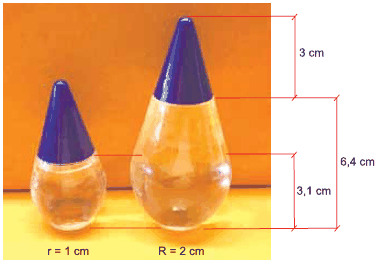 Duas embalagens de adoçantes são semelhantes desde suas bases circulares até a altura de 3,1 cm da menor delas. A maior embalagem tem 6,4 cm de altura e ambas recebem tampas idênticas em forma de cone circular reto. Sabe-se que a altura de cada tampa é 3 cm e que os raios das bases das duas embalagens medem 1 e 2 centímetros, como mostra a figura.
