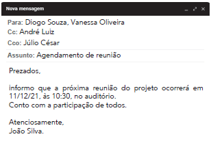 O Gmail, serviço gratuito de correio eletrônico criado pela Google, foi utilizado pelo coordenador de um projeto universitário para agendar uma reunião. Observe sua mensagem, que foi enviada e recebida com sucesso: